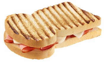 Toast [VETEMJÖL, vatten, solrosolja, SKUMMJÖLKPULVER, jast, salt, dekstrose, emulgator (E472e)], rökt skinka (19,6%) [flaskkött (96%), salt, naturlig arom, sukros, antioxidant (E301), konserveringsmedel (E250)], edamerost (MJÖLK) (19,6%).