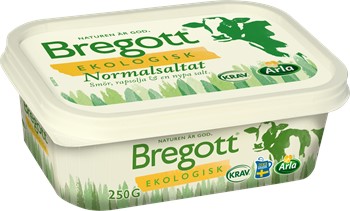 Bregott® Ekologisk matfettsblandning är helt fri från konserveringsmedel eller andra tillsatser. Kärnat till smör av ekologisk svensk grädde blandat med rapsolja och en nypa salt – naturligt gott. Grädden finns med för den goda smakens skull och rapsoljan gör det lättare att bre på brödet. Bregott® Ekologisk gör sig allra bäst på smörgåsen men passar också att steka i och baka med. Symbolen med den blågula gräddkannan garanterar att produkten är gjord på 100 procent svensk grädde.