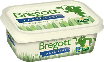 Naturligt gott, helt enkelt men utan laktos! Bregott® Laktosfri är kärnat till smör av svensk grädde blandat med rapsolja och en nypa salt. Grädden finns med för den goda smakens skull och rapsoljan gör det lättare att bre på brödet. Bregott® Laktosfri gör sig allra bäst på smörgåsen men passar också att steka i och baka med. Symbolen med den blågula gräddkannan garanterar att produkten är gjord på 100 procent svensk grädde.
