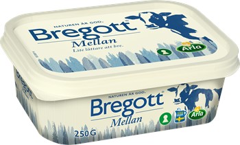 Bregott® Mellan är en lite mjukare, lite mer bredbar matfettsblandning. Ett smakrikt alternativ med god smak, men med lägre fetthalt. Grädden finns med för den goda smakens skull och rapsoljan gör det lättare att bre på brödet. Bregott® Mellan gör sig allra bäst på smörgåsen, men passar också att steka i och baka med. Symbolen med den blågula gräddkannan garanterar att produkten är gjord på 100 procent svensk grädde. Produkten är nyckelhålsmärkt.