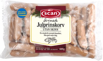 Scan Helg och Julprinskorv är en efterfrågad korv på julbordet! Blir snabbt och lätt färdig i stekpanna på medelvärme 2 - 3 min. Spricker inte. I Scan märkta produkter ingår endast svenskt köttråvara. Fri från Gluten, Laktos, Ägg, Soja-, Mjölk- och Ärtprotein. Skinnfri