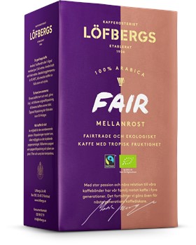 Löfbergs bryggkaffe Fair mellanrost ett mellanrostat och välbalanserat bryggkaffe med inslag av en ljuvligt frisk, tropisk fruktighet. Rostning 2/5 Fyllighet 3/5 Syrlighet 3/5. BRYGGKAFFET är 100% arabicakaffe från Syd- och Centralamerika. Kaffet är certifierat av Fairtrade, vilket är en oberoende produktmärkning med fokus på mänskliga rättigheter. Märkningen skapar förutsättningar för odlare och anställda i utvecklingsländer att förbättra sina arbets- och levnadsvillkor. Genom att köpa Fairtrademärkt kaffe motverkar du barnarbete, miljöförstöring och diskriminering. Du främjar organisationsrätten och demokratin och ser till att odlare och arbetare får bättre betalt. Fair mellanrost är dessutom ekologiskt odlat kaffe, märkt med EU-lövet, vilket visar att kaffebönorna fått växa och mogna utan konstgödning och kemiska bekämpningsmedel. EN GOD KOPP KAFFE: Vi rekommenderar att tillreda Fair mellanrost i en kaffebryggare. Innan du börjar brygga kaffet bör du se till så att bryggutrustningen är ren. För att det ska smaka så gott som möjligt är det viktigt att du doserar rätt, ett kaffemått eller en rågad matsked per kopp, 6-8 g per 1,5 dl. Helst ska vattnet vara mellan 92- 96°C. Om du har en bryggare med för låg temperatur är det bättre att koka upp vattnet och hälla det över kaffet i filterhållaren. HÅLLBARHET PÅ KAFFET: Bryggkaffet bör förvaras torrt och svalt i väl tillsluten originalförpackning, då bevaras kaffets aromer bäst. Öppnad förpackning bör förbrukas inom 10-14 dagar.