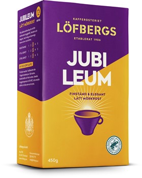 Löfbergs Jubileum är ett lätt mörkrostat bryggkaffe, finstämt och elegant, med inslag av blommiga toner och rund sötma. Rostning 3/5 Fyllighet 3/5 Syrlighet 3/5. BRYGGKAFFET är 100% arabicakaffe från Syd- och Centralamerika, Etiopien och Kenya. Kaffet är certifierat av Rainforest Alliance, vilket är en oberoende organisation som arbetar för att skapa hållbara försörjningsmöjligheter för kaffeodlare och att bevara den biologiska mångfalden. EN GOD KOPP KAFFE: Vi rekommenderar att tillreda Jubileum i en kaffebryggare. Innan du börjar brygga kaffet bör du se till så att bryggutrustningen är ren. För att det ska smaka så gott som möjligt är det viktigt att du doserar rätt, ett kaffemått eller en rågad matsked per kopp, 6-8 g per 1,5 dl. Helst ska vattnet vara mellan 92- 96°C. Om du har en bryggare med för låg temperatur är det bättre att koka upp vattnet och hälla det över kaffet i filterhållaren. HÅLLBARHET PÅ KAFFET. Vi rekommenderar att kaffet förvaras torrt, svalt och mörkt, i sluten ursprungsförpackning. Kaffets smak skadas av syre, exponering av ljus samt fukt som uppstår om kaffet utsätts för temperaturförändringar. Öppnad förpackning bör förbrukas inom 10-14 dagar. NÄR KAFFET ÄR SLUT Av miljöskäl är den arombevarande plasten i förpackningen mycket tunn vilket möjliggörs av det skyddande pappersomslaget. Vår förpackning innehåller dessutom plast från förnybar råvara. Källsortera pappret som pappersförpackning och påsen som plast. Filter och sump sorteras som matavfall och kan komposteras.