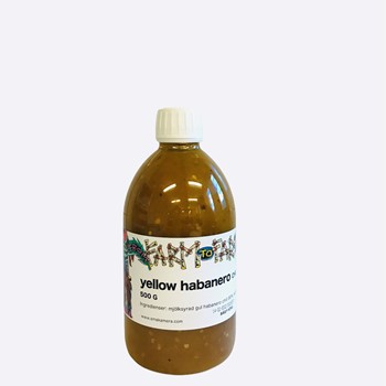 Mjölksyrad, härligt het krossad Gul Habanero i smidig 500g flaska. Gul Habanero är en het fruktig chili, underbar att använda som smaksättare till det mesta.