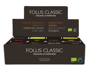 Sortimentask med 160 påsar. 8 smaker English Breakfast, Earl Grey, Citron, Forest Fruit, Svartvinbär, Grönt te, Citron Grönt te Mint, Rooibos. Ekologisk & Fairtrade